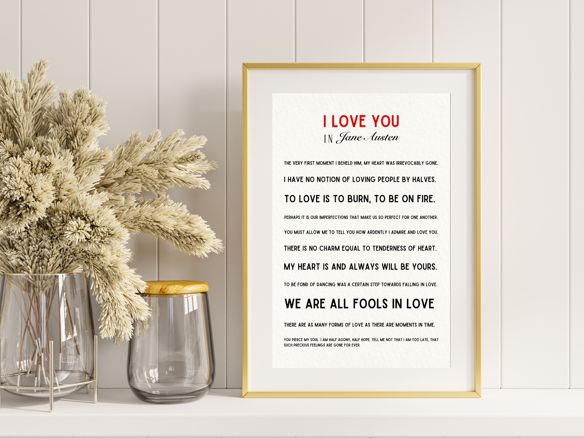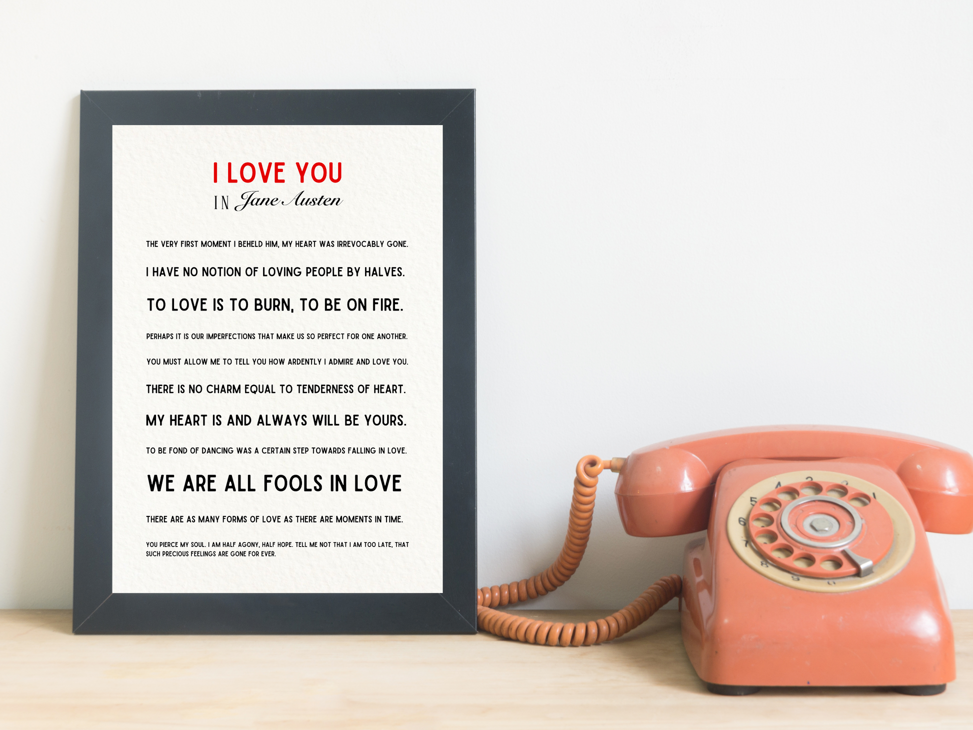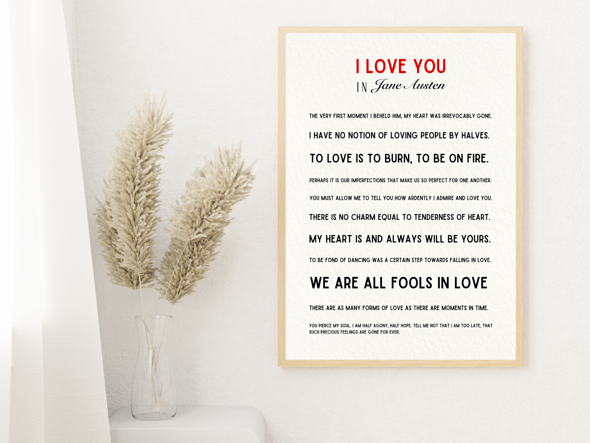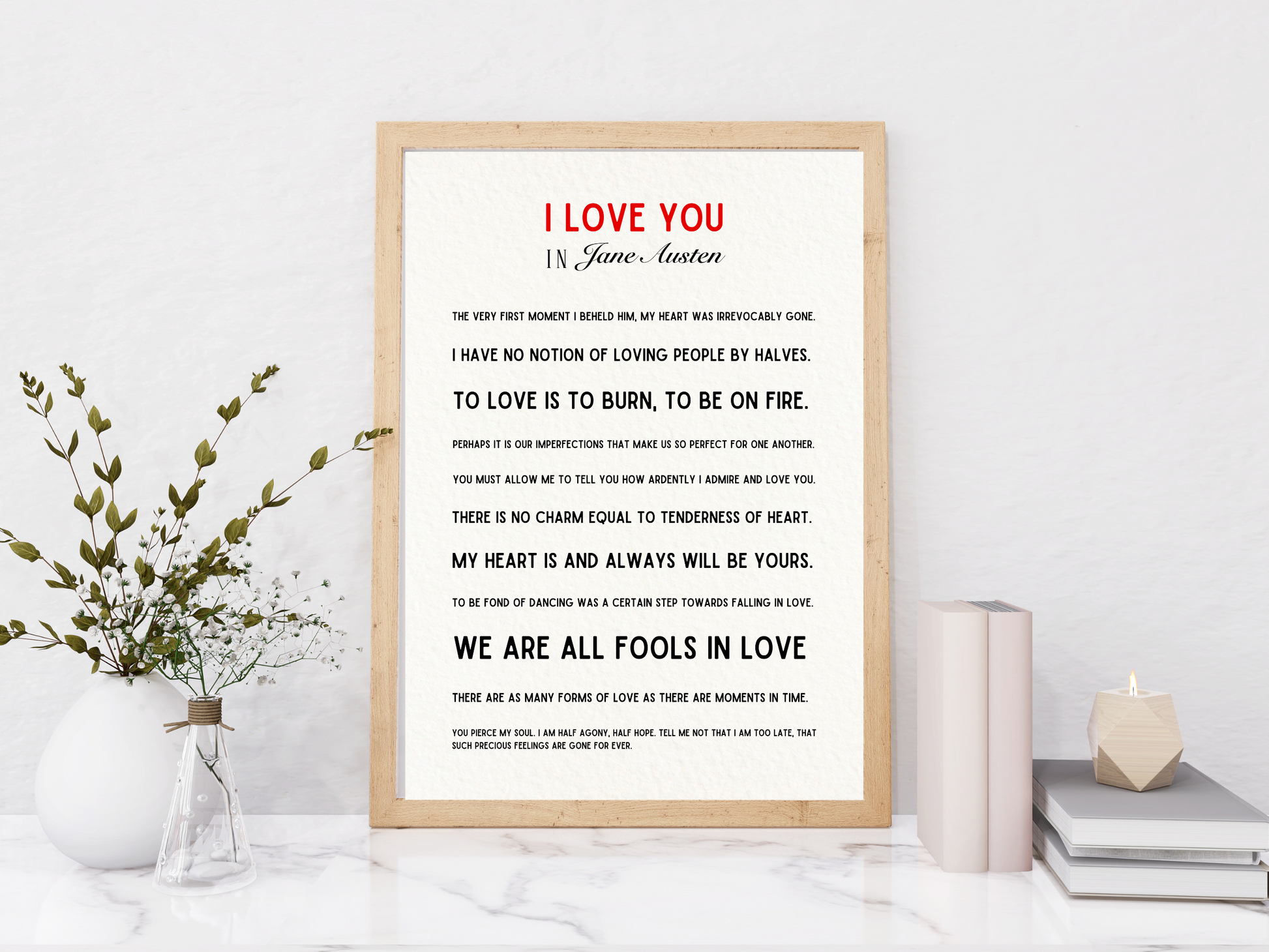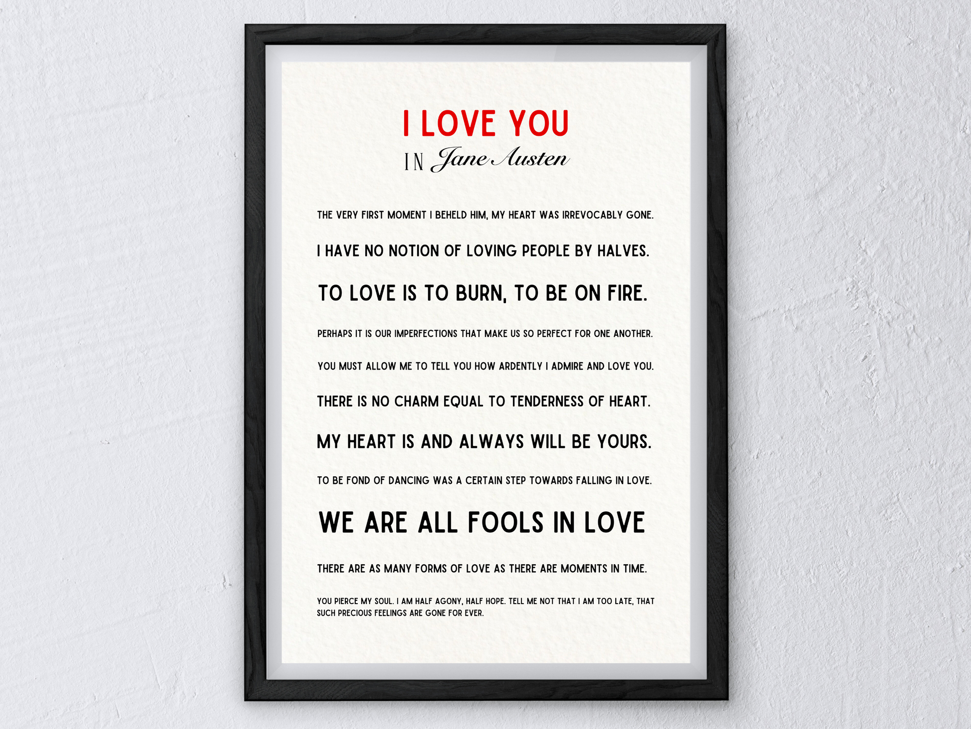 A selection of love quotes from Jane Austen from her most famous works including Pride and Prejudice, Northanger Abbey and Persuasion. With a minimalist and contemporary feel, this beautiful print can go in any room in the house. It also makes a perfect wedding or anniversary gift for a Jane Austen fan.