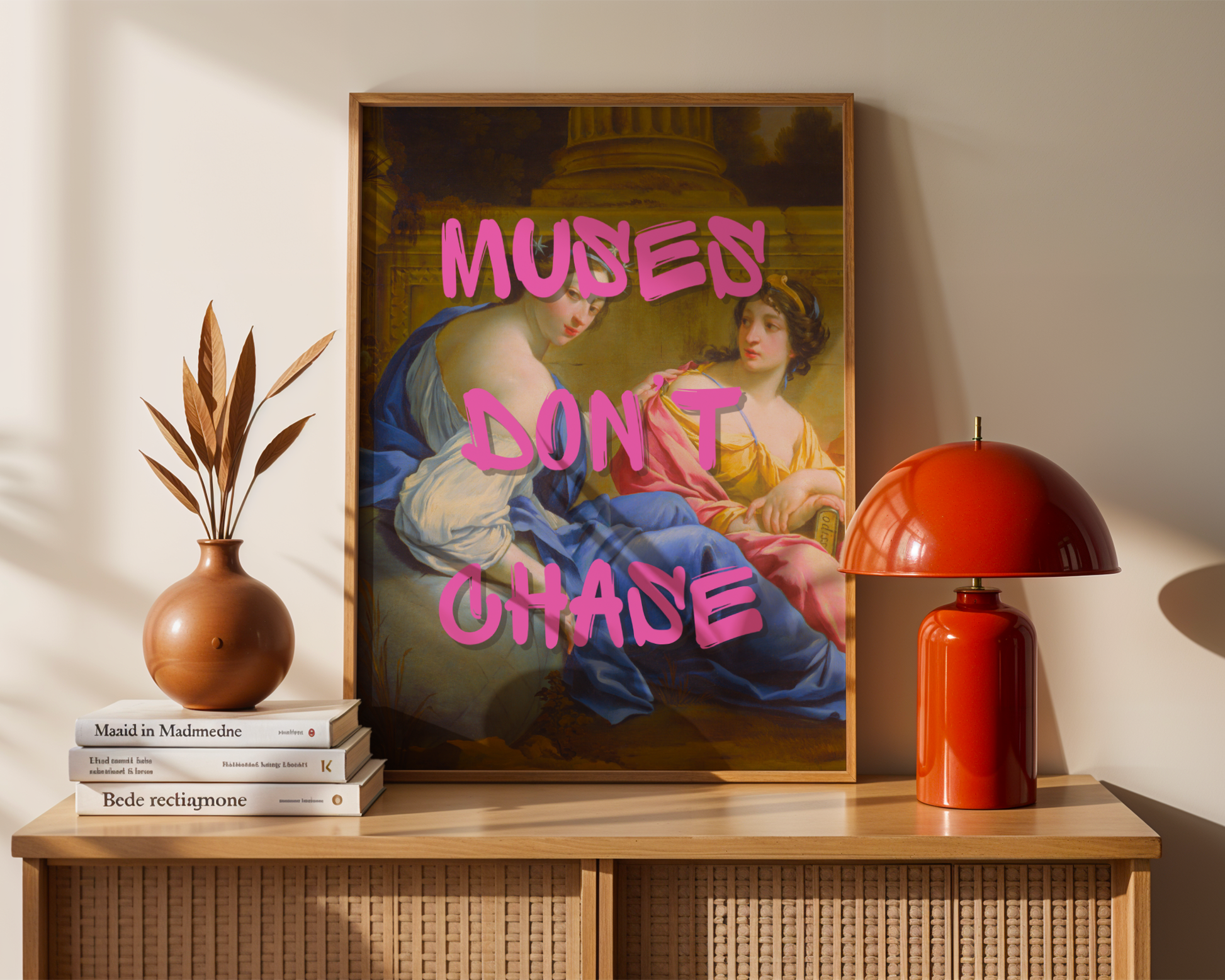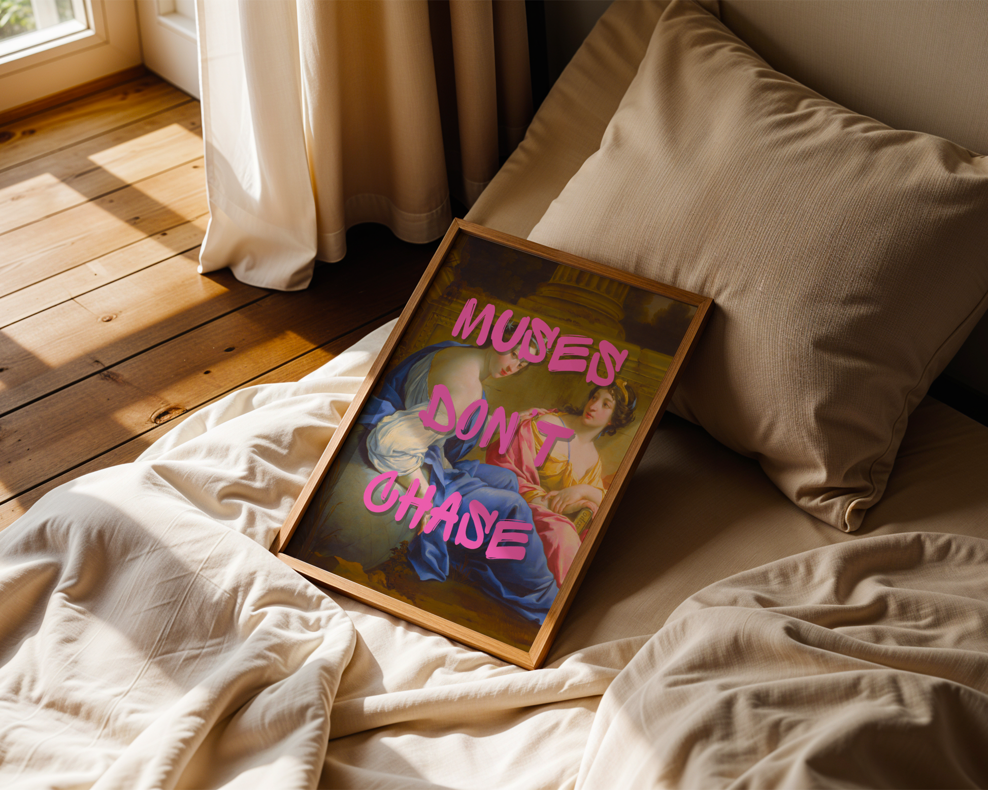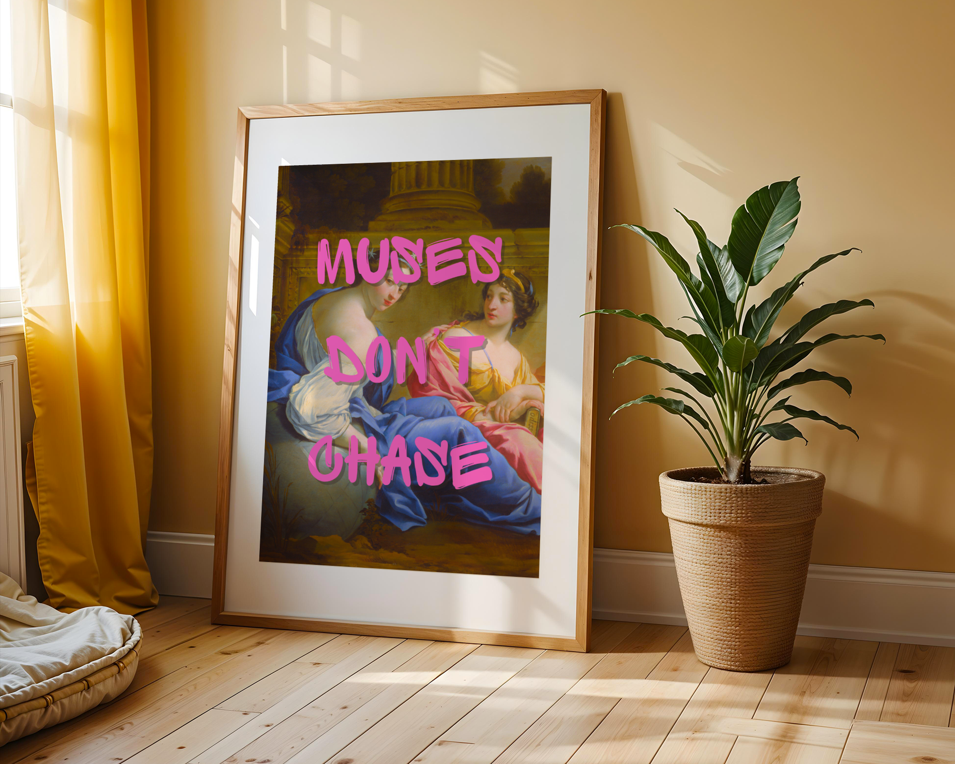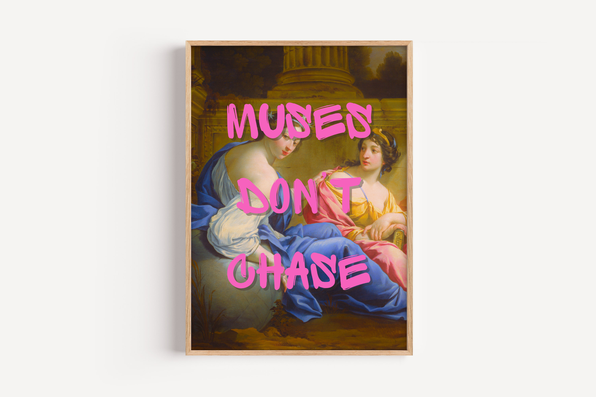 Make a powerful statement in your home or office with this bold feminist and motivational wall art print. Featuring Simon Vouet’s classical painting The Muses, layered with striking hot pink graffiti-style text that reads: 'Muses Don’t Chase', this print is the perfect blend of timeless artistry and contemporary empowerment. Ideal for fans of modern classical art, motivational quote posters, and feminist home decor, it adds style and personality to any space.
