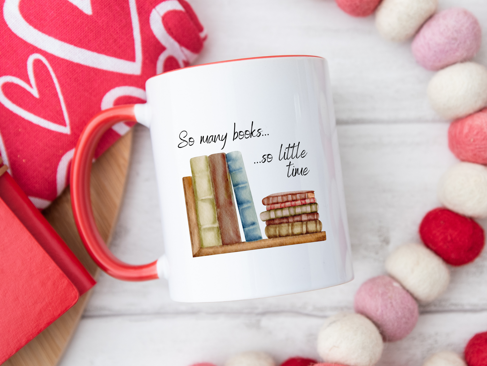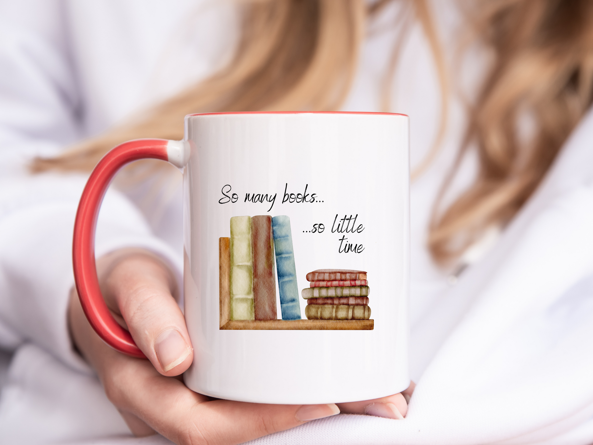 Embrace your love for reading with this beautifully designed ceramic mug featuring the charming phrase, "So many books... so little time." The watercolor illustration of stacked books adds a cozy, bookish vibe, making it a must-have for every bibliophile. The vibrant red handle complements the minimalist design, giving the mug a stylish touch that stands out whether you're at home, in the office, or curled up with your favorite novel.